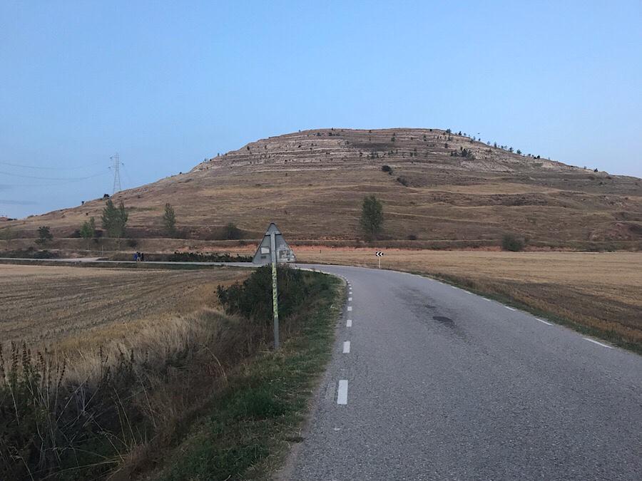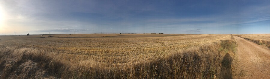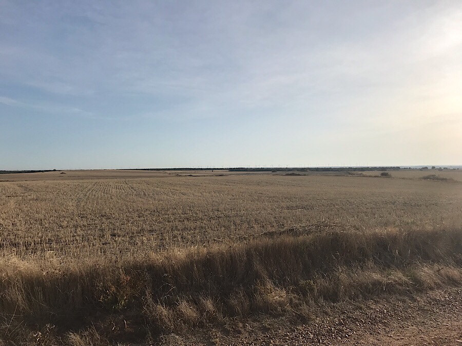After a while the path leads up to the first section of meseta where there is a wide expanse of very flat land. Somewhat featureless but due to the altitude of 900+ metres, it is windy and there are very many wind turbines on the edges of the meseta.