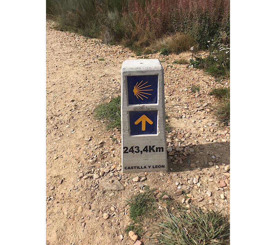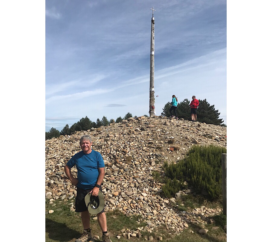 One of the milestones on this day was the “Cruz Ferro” or iron cross. It is a cross about 75cm in height mounted on a tall wooden pole like an electricity pole. There is a small chapel nearby. Several walking and cycling pilgrims stopped to take photos and I got my photo taken that way.